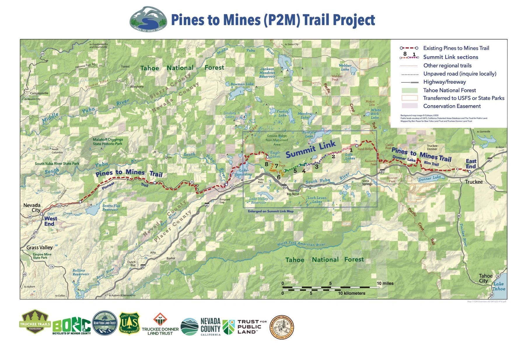 The Pines to Mines Alliance is a collaborative partnership between the Tahoe National Forest, Bear Yuba Land Trust, Truckee Trails Foundation, Truckee Donner Land Trust, Gold Country Trails Council, Bicyclists Of Nevada County, and Nevada County. United by a shared vision, these organizations are working together to bring to life a long-distance singletrack trail that connects both ends of Nevada County through some of the region’s most breathtaking and adventurous terrain.