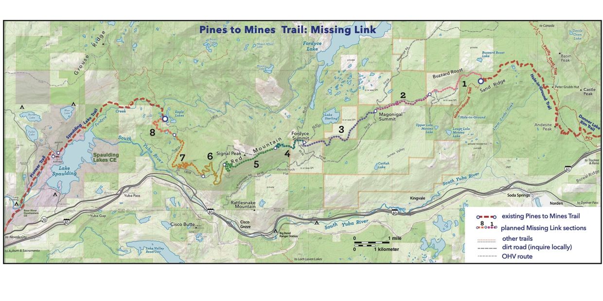 Once completed, Pines to Mines will be one of the only long-distance, single track, multi-use backcountry trail for hikers, bikers, and equestrians in the region. The Pines to Mines Trail Alliance is a partnership between Tahoe National Forest, Bear Yuba Land Trust, Truckee Trails Foundation, Truckee Donner Land Trust, Gold Country Trails Council, Bicyclists of Nevada County, and Nevada County.