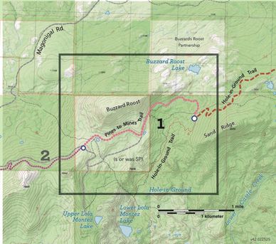 This 15,682-foot (2.9 mile) section will allow users to avoid the sometimes-busy dirt Rattlesnake Road and the steep ups and downs of the 4x4 Lake Sterling Spur. It gently descends from Rattlesnake Road, west of Magonigal Summit, to Lake Sterling Road. There will not be a great deal of elevation change in this section, and it will be an excellent opportunity to experience the grand vistas of the crest to the south and endless carpets of wildflowers when in season.