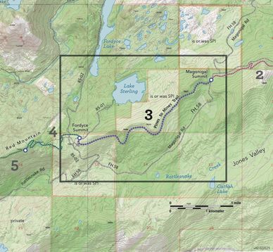 This 7,840-foot (1.5 mile) section transitions from rocky rubble on Red Mountain in the east to second-growth forest in the west. The trail will be a pleasant alternative to hiking or riding on the existing jeep road.