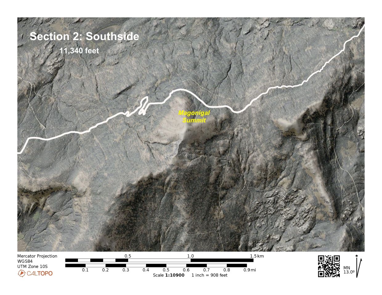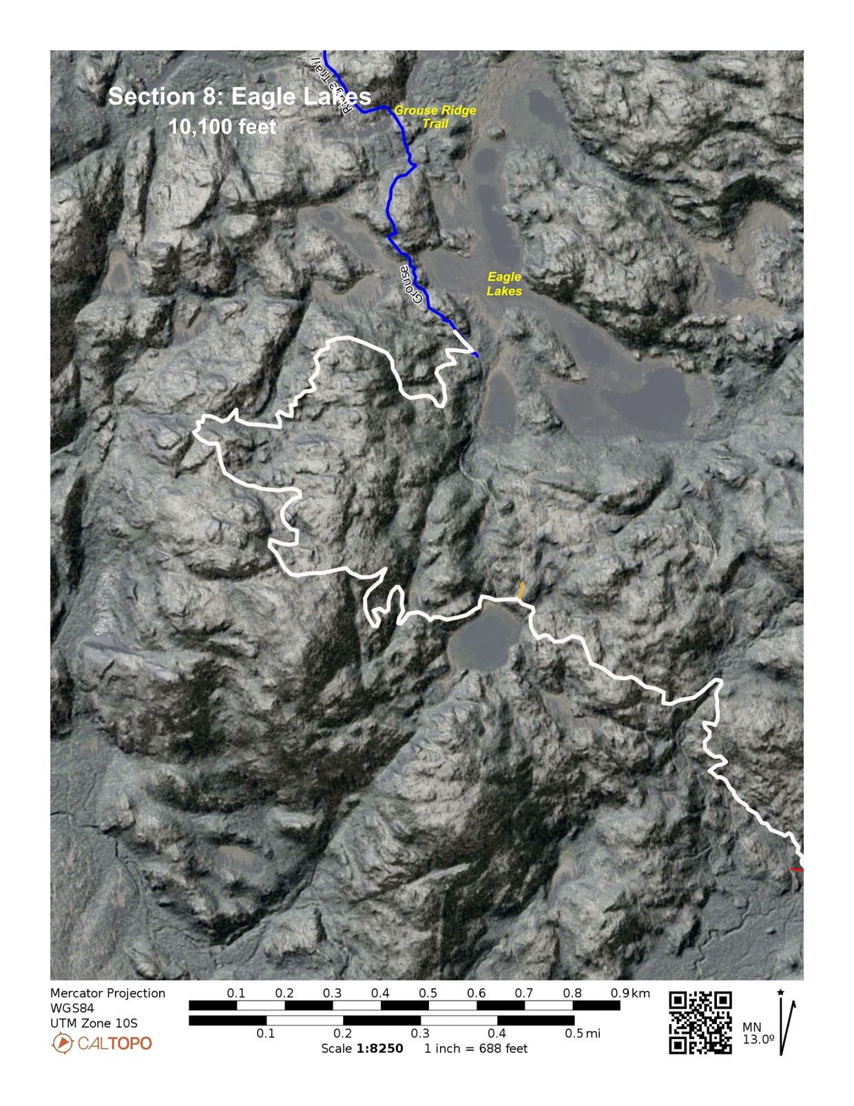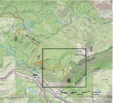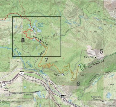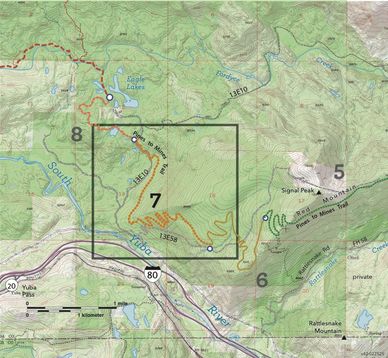 The major construction challenge is the 18 turns required to manage an 800-foot elevation change over two miles. It is rocky and will be technical. East and west of this pitch the terrain is mostly gentle, though numerous drainages in the west must be negotiated. Armored rock crossings will be required to cross numerous drainages. Trailer parking for machine access is available at the Eagle Lakes Staging Area.