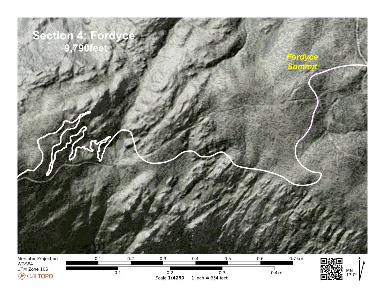 The .2 mile boulder field at the east end of Section 4, and the six switchbacks and steep terrain at the west end of the section will make construction very slow and technical. However, access for construction is straightorward via improved dirt roads.