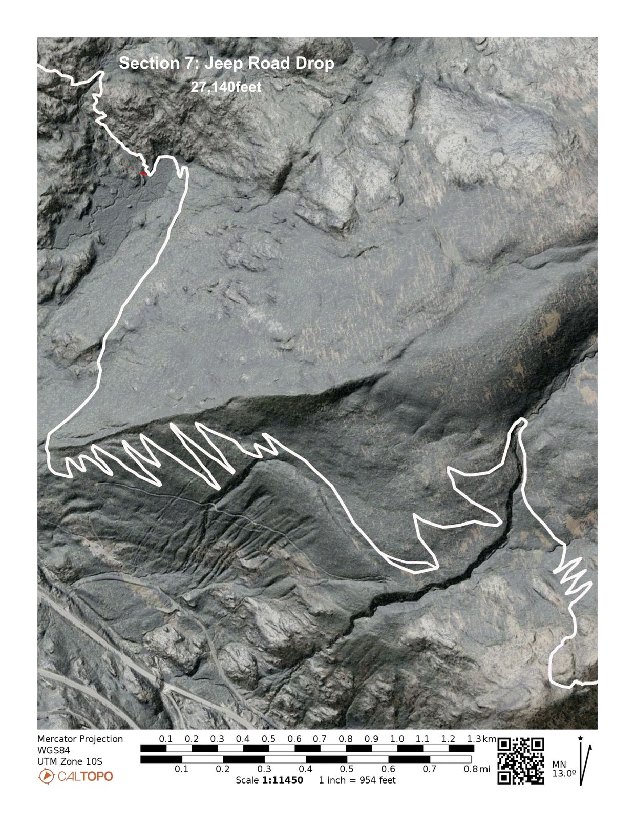 While driving access to the western end is straightforward on improved dirt roads, access to the eastern end via the unimproved Rattlesnake Road is slower and requires a high-clearance vehicle to haul a trailer. With one approximately 100-yard exception, construction challenges across the generally steep side-slope are minimal. Two drainages will require armored rock crossings. The exception is a volcanic rock formation with at least two pinch points to negotiate. It will require extensive rock work and likely retaining walls constructed from existing rock in the area.